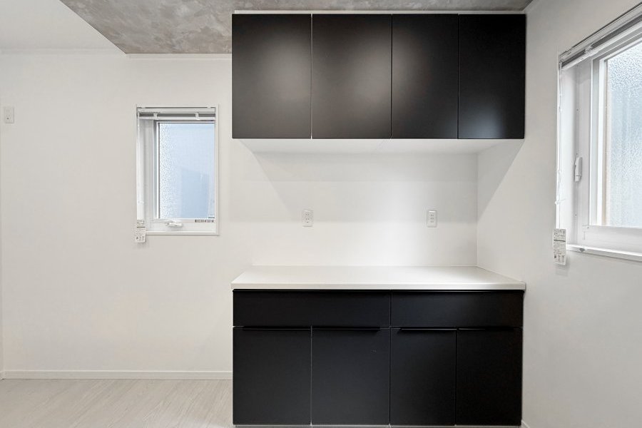 二の字型のカップボードは、真ん中に家電を置くことができるため、省スペースで効率的な収納が特徴です。