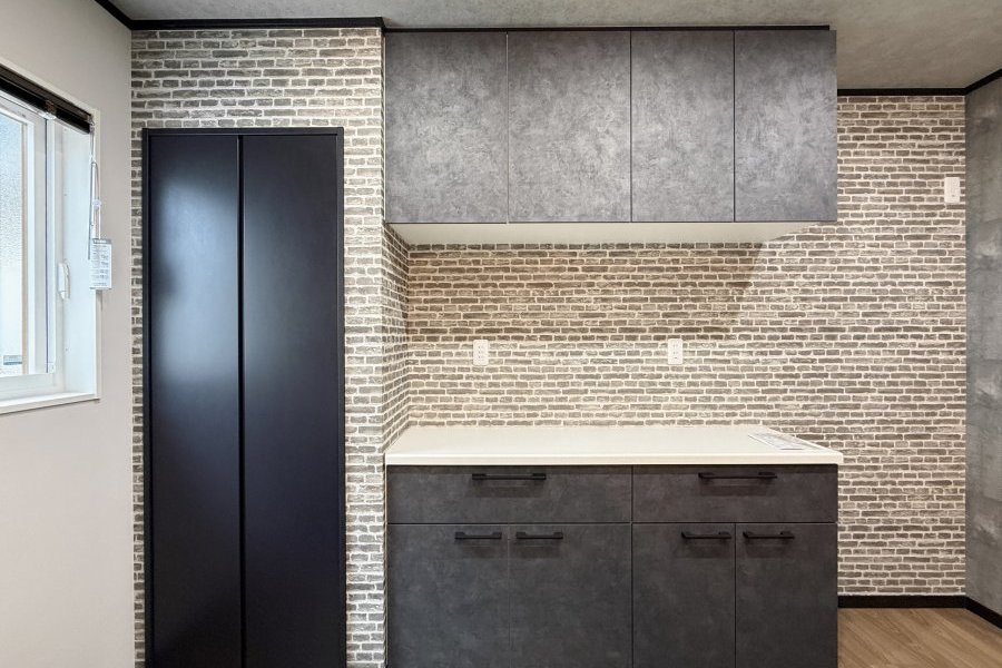二の字型のカップボードは、真ん中に家電を置くことができるため、省スペースで効率的な収納が特徴です。