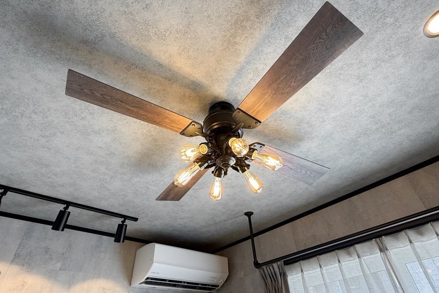 リビングにはシーリングファンを設け、ヴィンテージな雰囲気をより一層引き立てます。 -