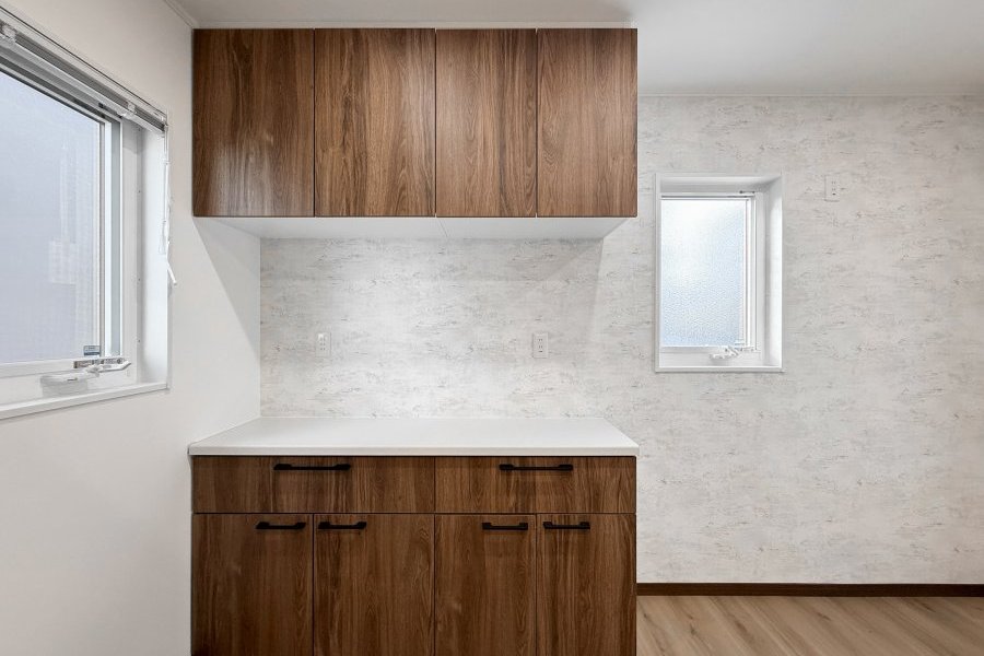 二の字型のカップボードは、真ん中に家電を置くことができるため、省スペースで効率的な収納が特徴です。