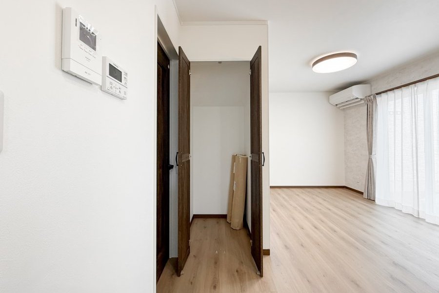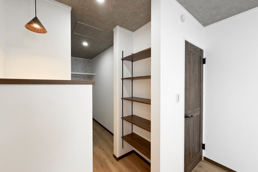 キッチン・洗面所の中間にあるため、掃除道具やストック品、掃除機など大きな物の収納にも最適です。 -