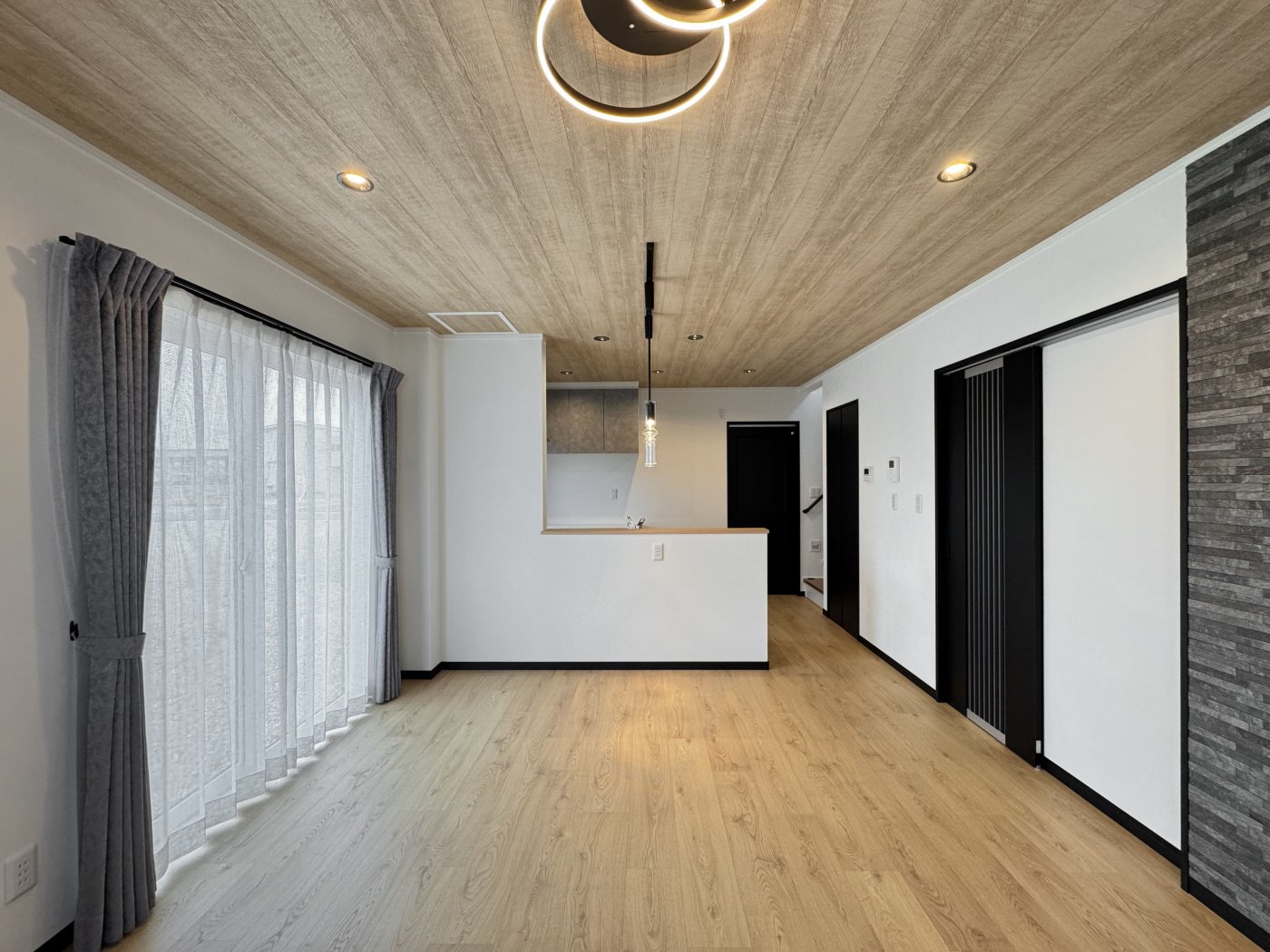 木目×石目×ブラックをバランス良く取り入れたLDK。