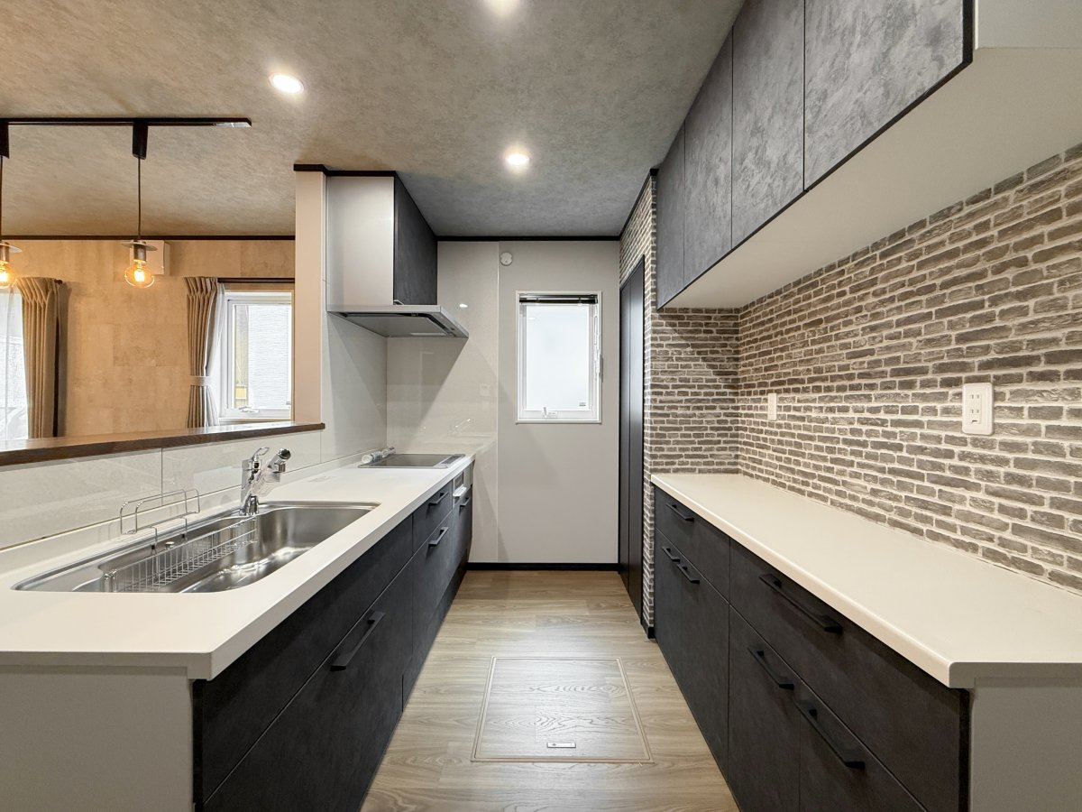 重厚な色合いと洗練された質感が調和する、上質なキッチン空間。