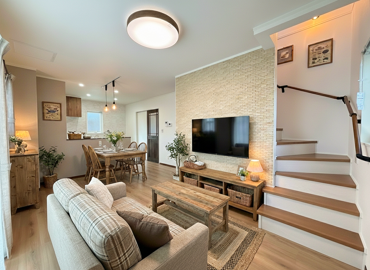 自然素材の質感を取り入れたカントリーモダンスタイルの14帖LDK。