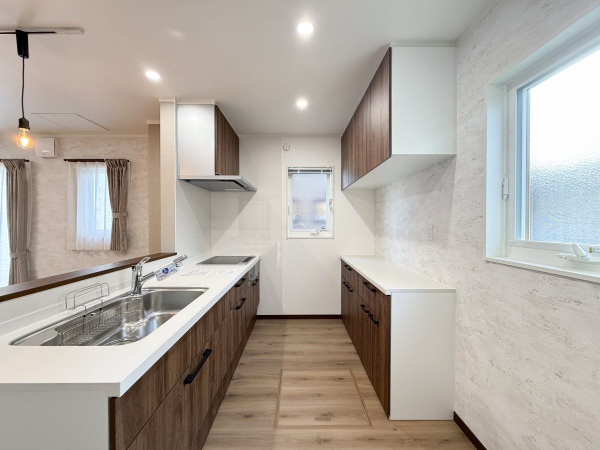 木目の温かみが広がるキッチンは、明るく落ち着いた雰囲気が魅力。