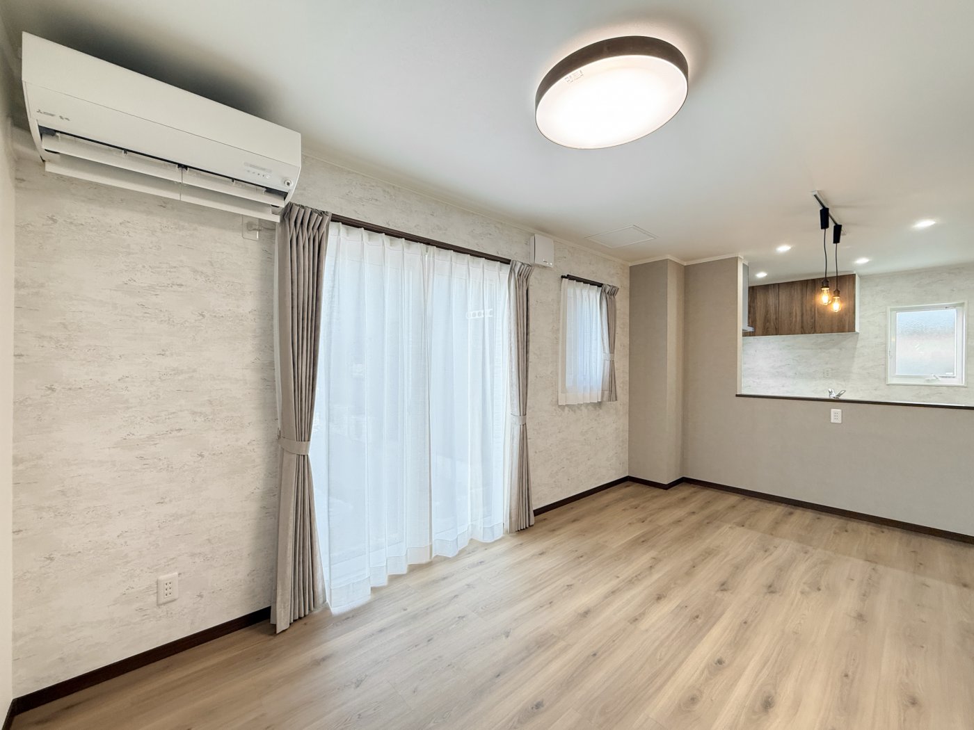 やわらかな色合いの床と壁面が、家族のくつろぎを包み込む落ち着いた空間です。