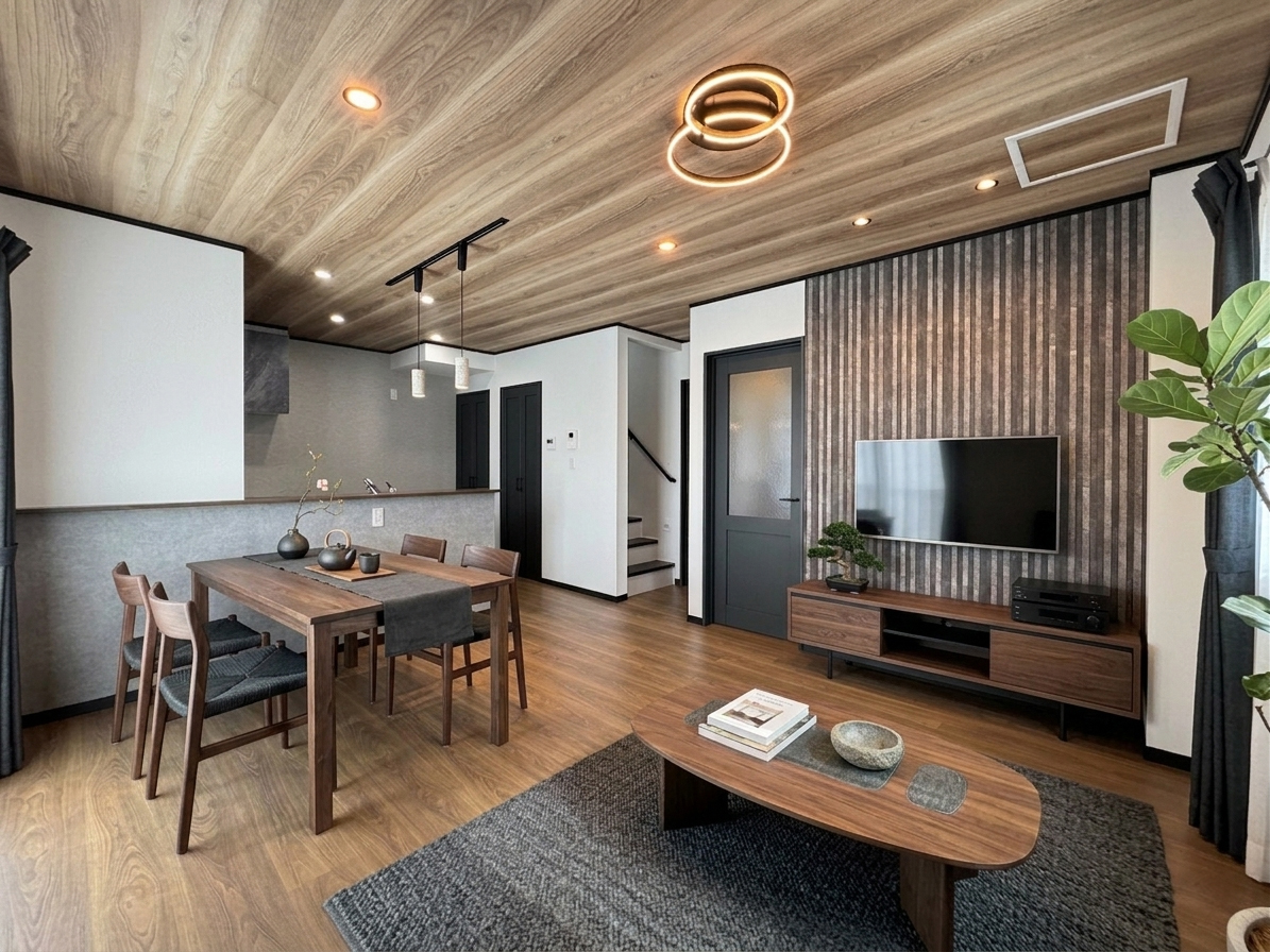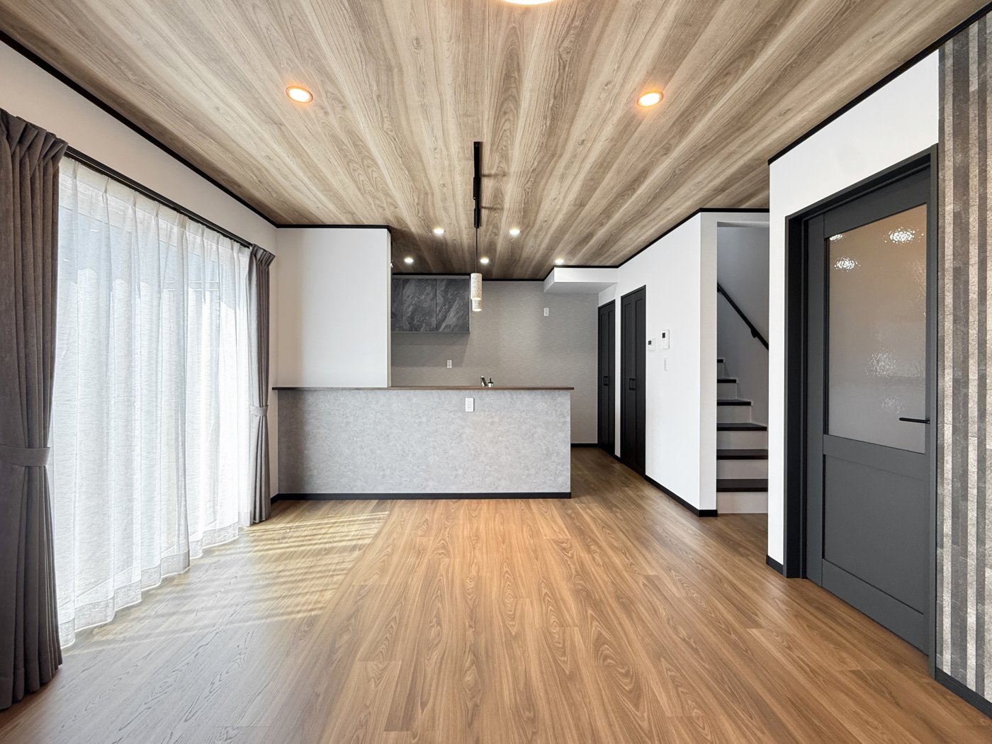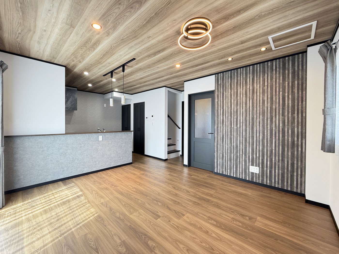 木目の天井とフローリングが美しく調和した、14帖のLDKです。