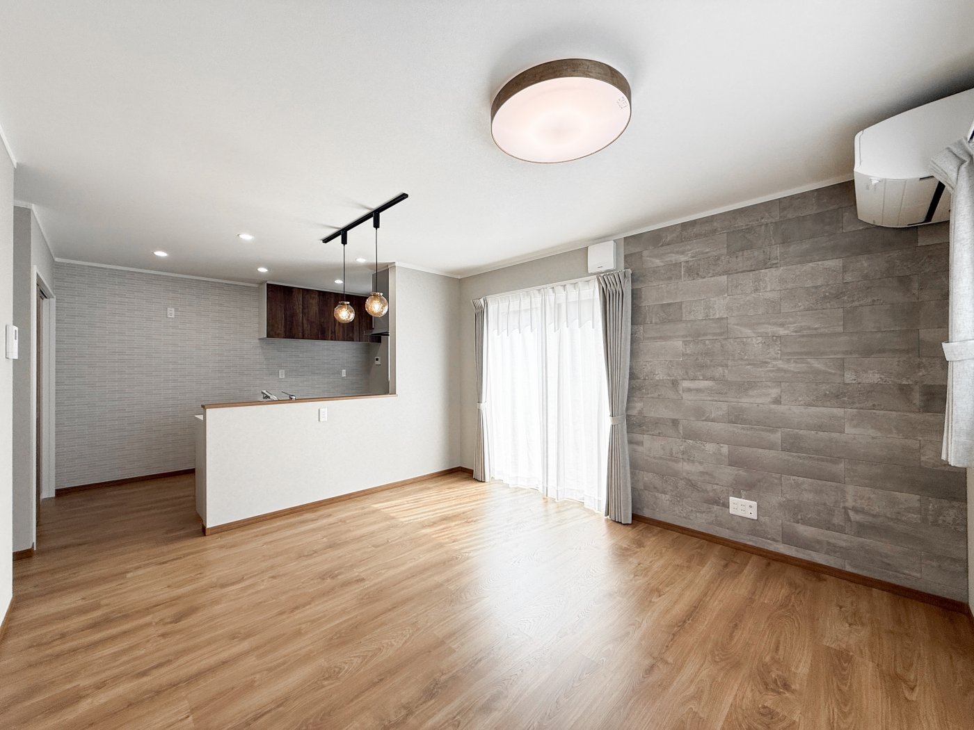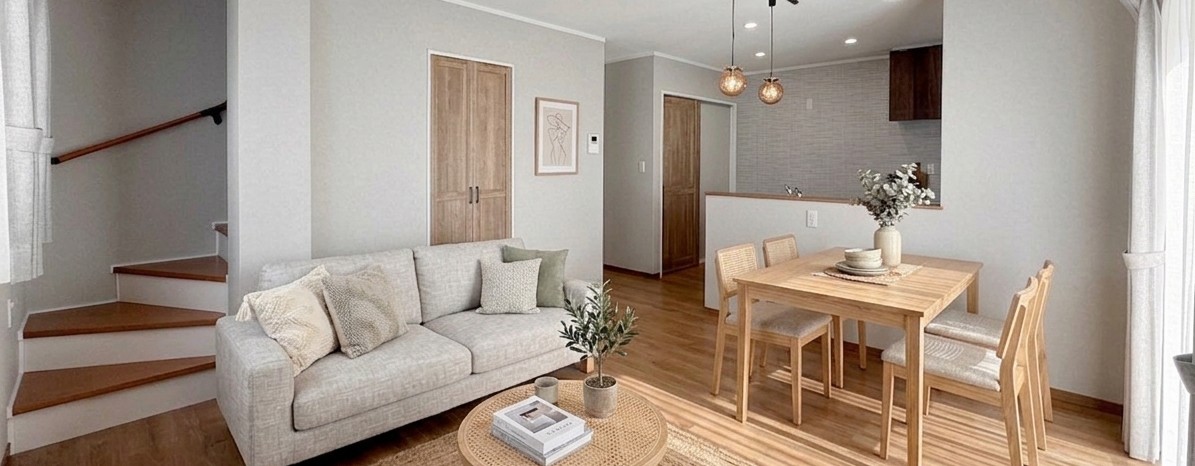 LDKは14帖で、グレー×ベージュのナチュラルモダンな空間です。